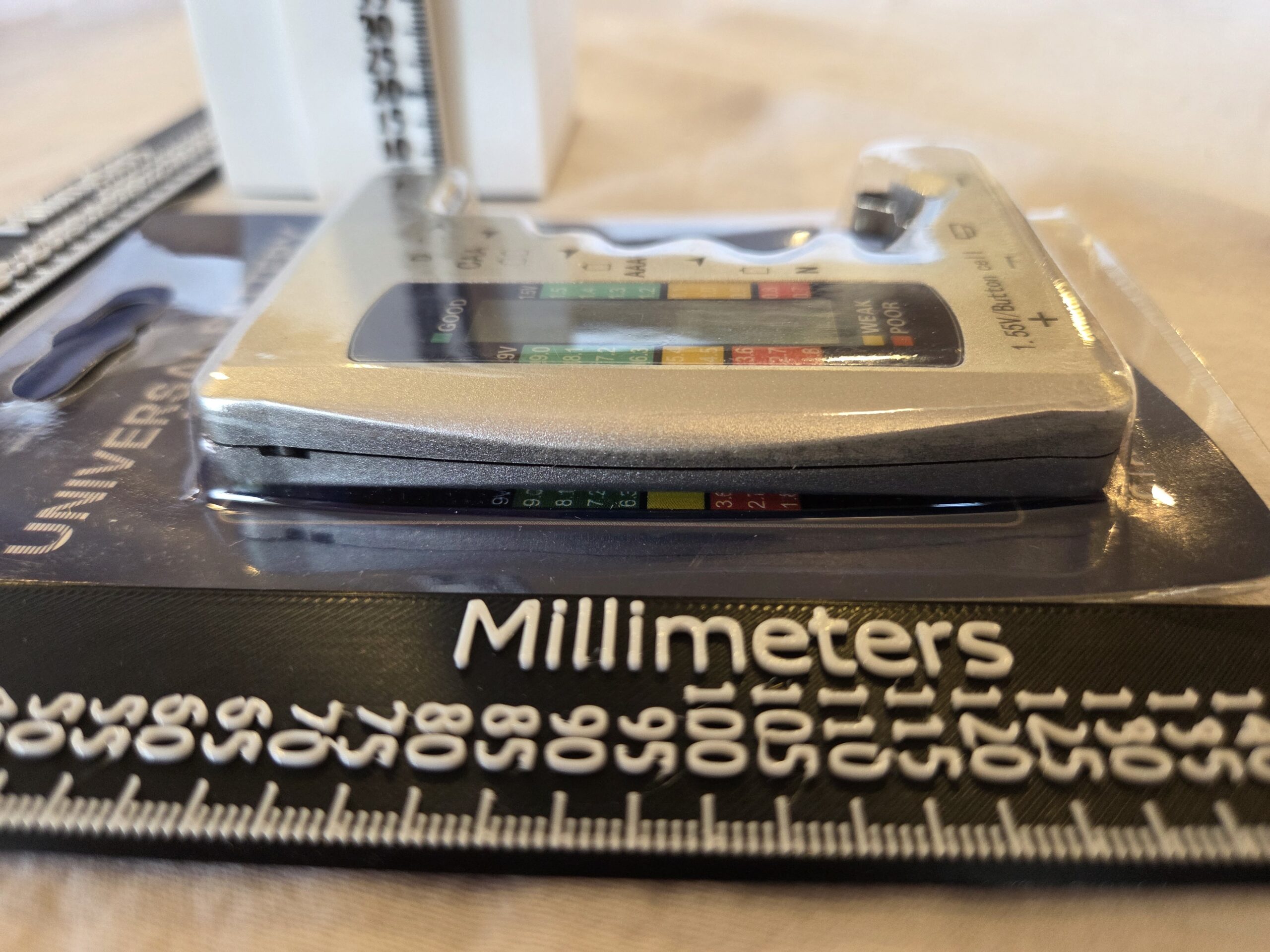 This simple battery tester is suitable for testing AAA, AA, 9V, and D batteries. Despite claims on the packaging, it can not test button cells or C batteries.