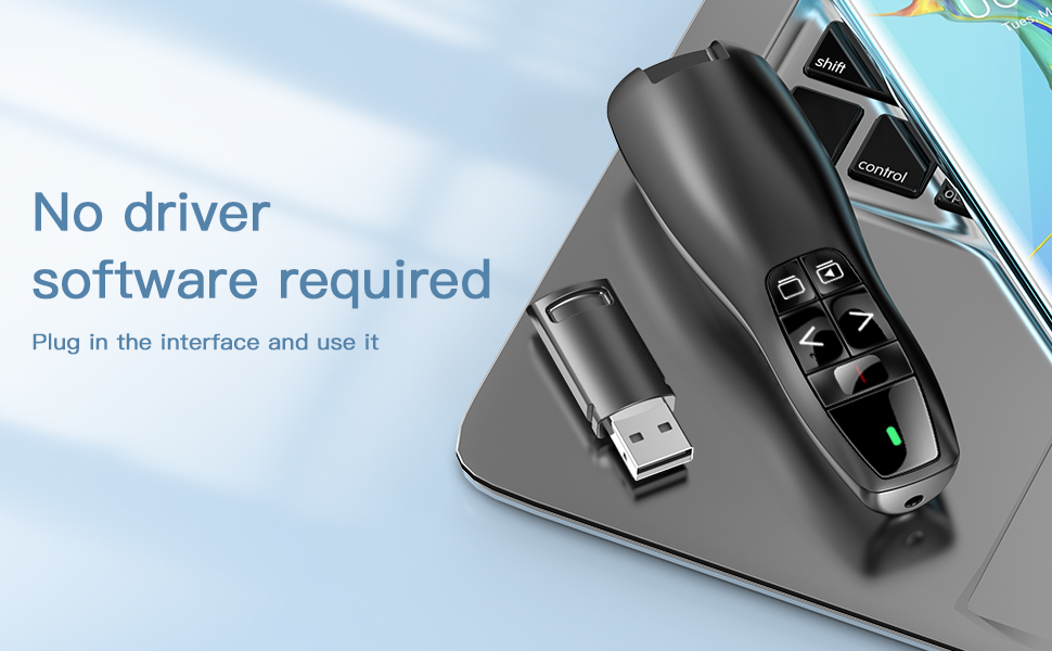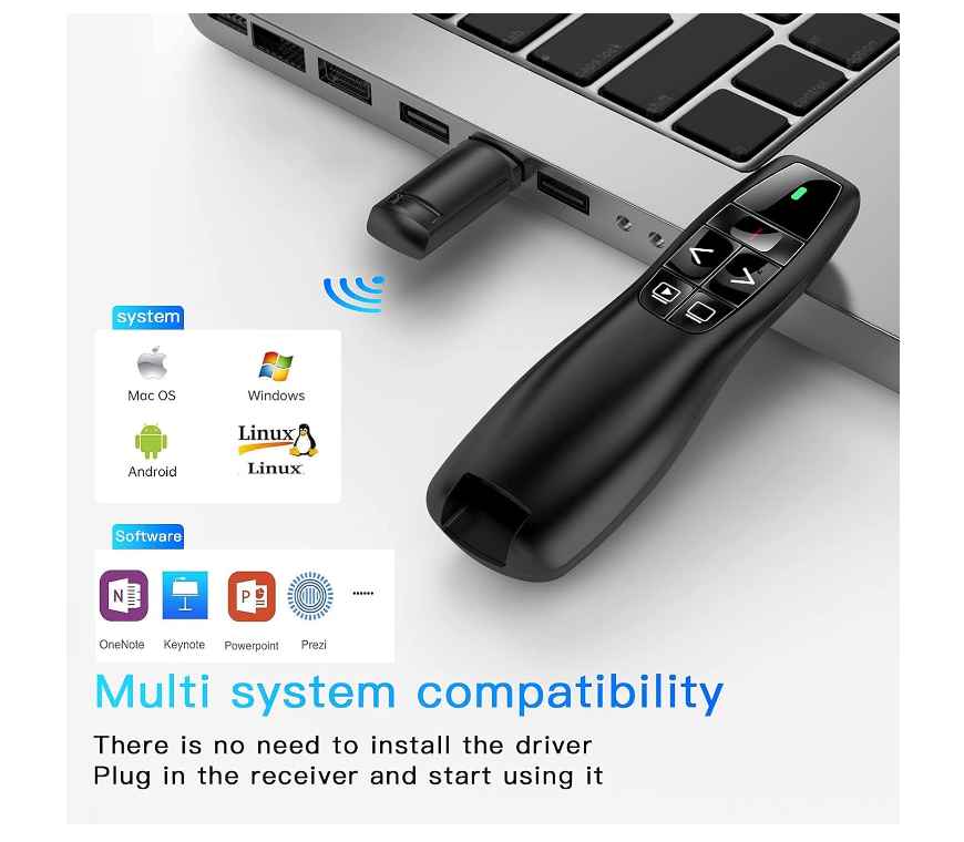 Compact and lightweight, this clicker fits easily into a pocket or bag. Because it is plug‑and‑play, you can connect instantly without installing extra software. This makes it perfect for classrooms, offices, and large venues.