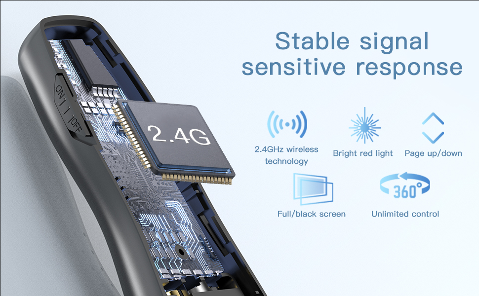 Responsive buttons let you move slides forward or backward with ease. The built‑in laser pointer helps highlight key points, keeping your audience focused. With a stable wireless connection, your presentation runs smoothly from start to finish.